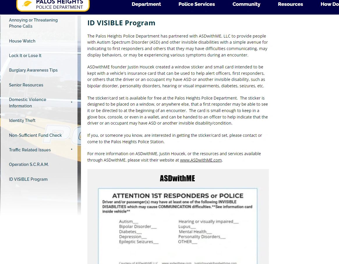 Palos Heights PD purchased and has available to their community ID VISIBLE. ID VISIBLE is a voluntary card/decal set for your vehicle informing the police or 1st Responders there is someone with an invisible disability inside.