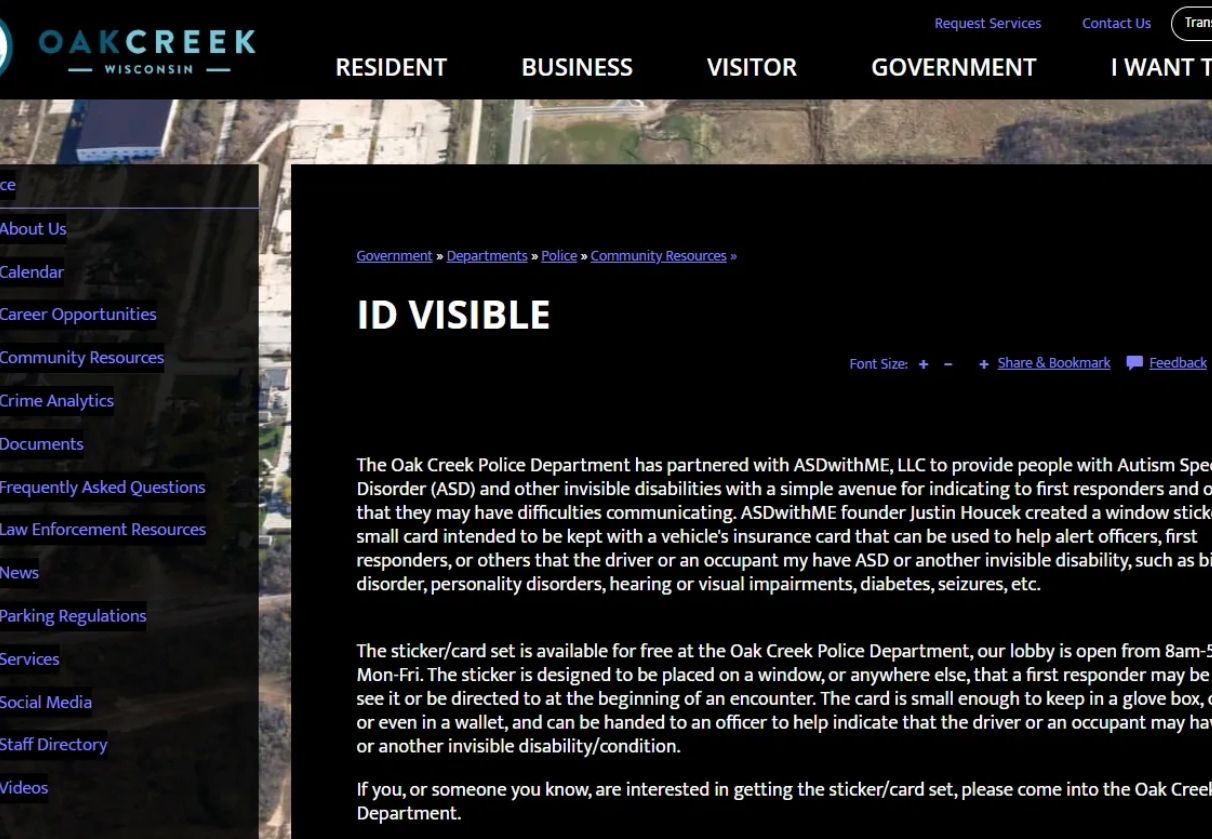 Oak Creek purchased and has available to their community ID VISIBLE. ID VISIBLE is a voluntary card/decal set for your vehicle informing the police or 1st Responders there is someone with an invisible disability inside.